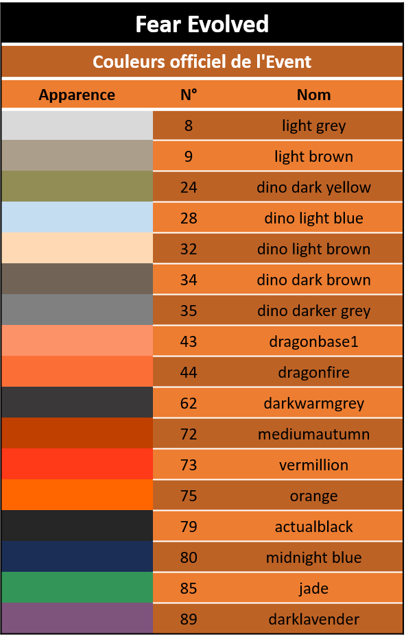 Un panneau affiche le numéro de chaque couleurs au The Event Castle, ainsi qu'un visuel de chacune via des taxidermies de Loup Sinistre.